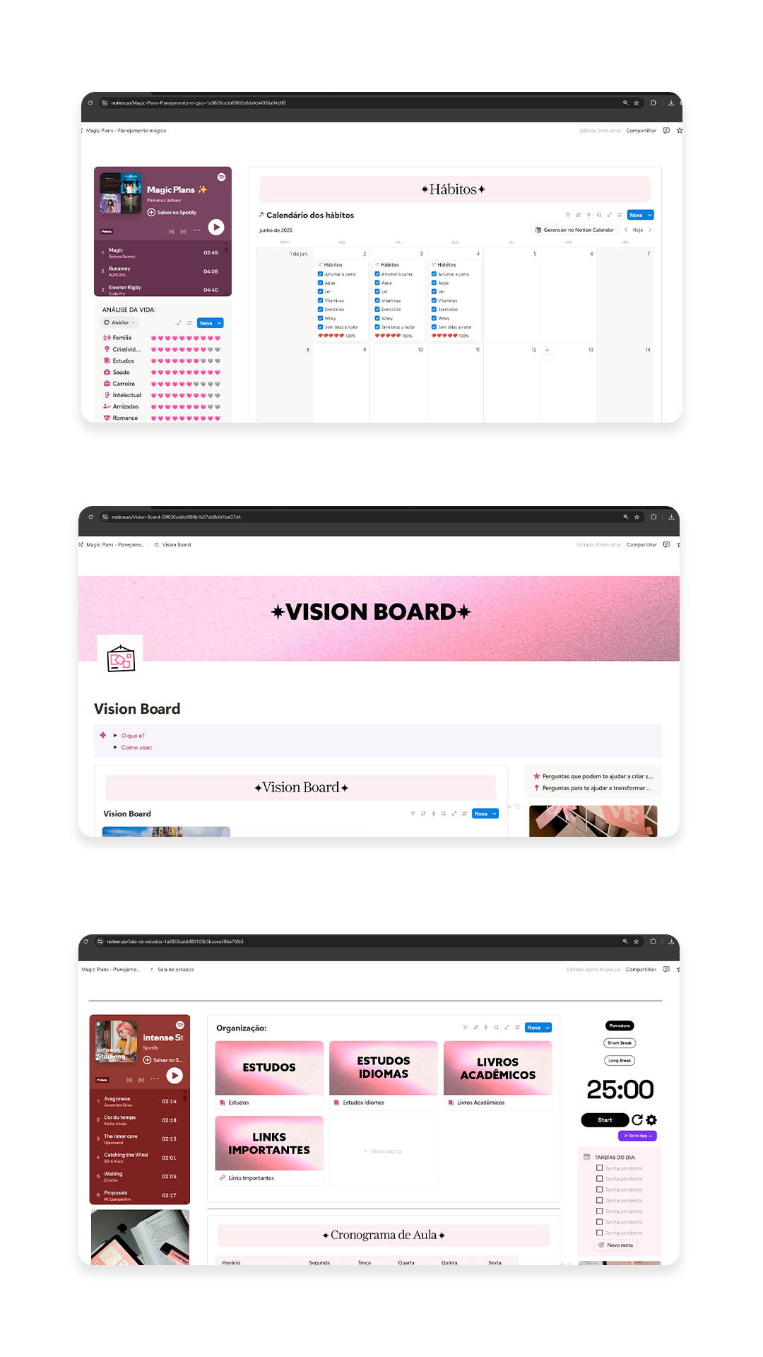 Tudo isso diretamente no Notion, pronto pra usar com seu template principal ou de forma separada.